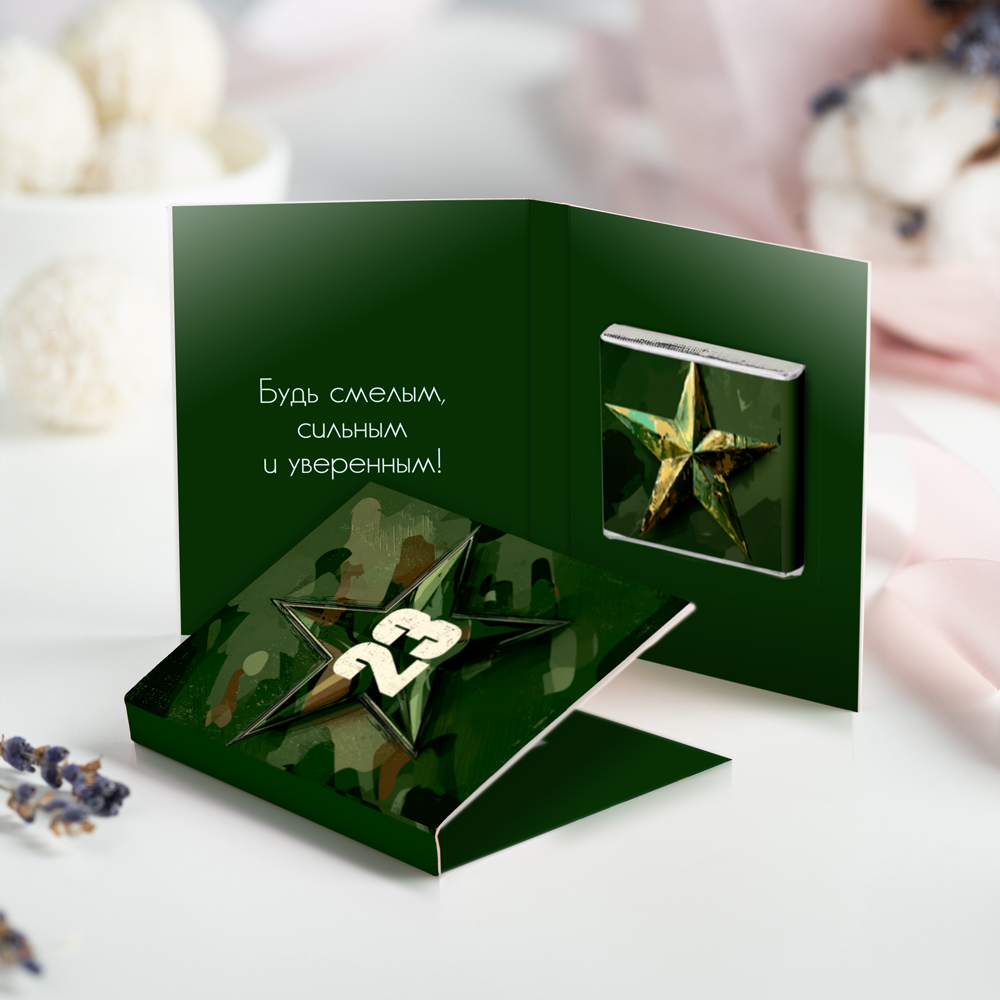 Внутри открытки - 1 шоколадка (вес 5 г., размер: 31 х 31 мм.)