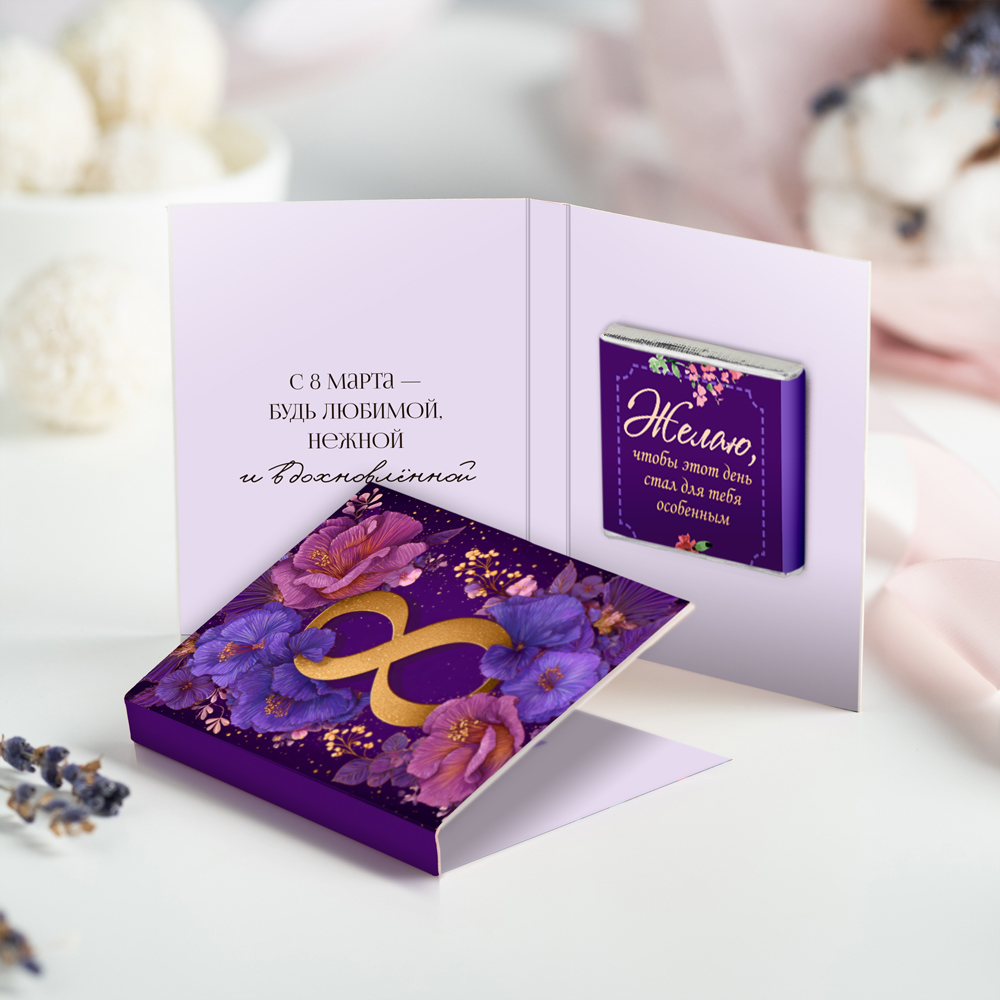 Внутри открытки - 1 шоколадка (вес 5 г., размер: 31 х 31 мм.)
