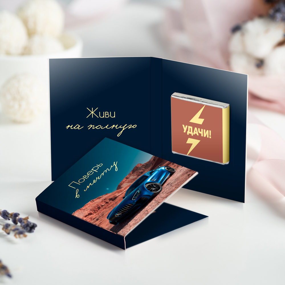 Внутри открытки - 1 шоколадка (вес 5 г., размер: 31 х 31 мм.)