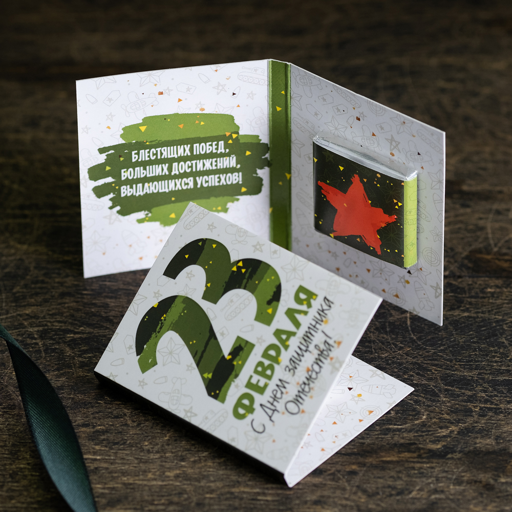 Внутри открытки - 1 шоколадка (вес 5 г., размер: 31 х 31 мм.)