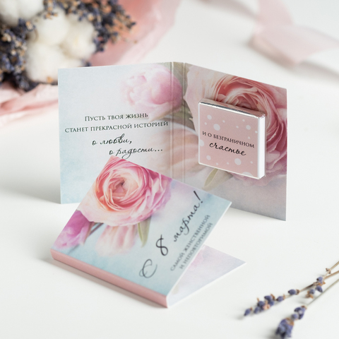 Внутри открытки - 1 шоколадка (вес 5 г., размер: 31 х 31 мм.)