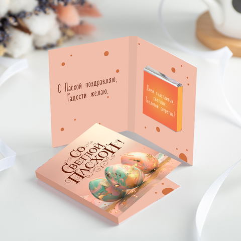 Внутри открытки - 1 шоколадка (вес 5 г., размер: 31 х 31 мм.)