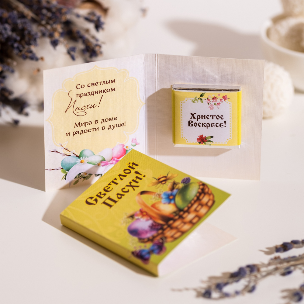 Внутри открытки - 1 шоколадка (вес 5 г., размер: 31 х 31 мм.)