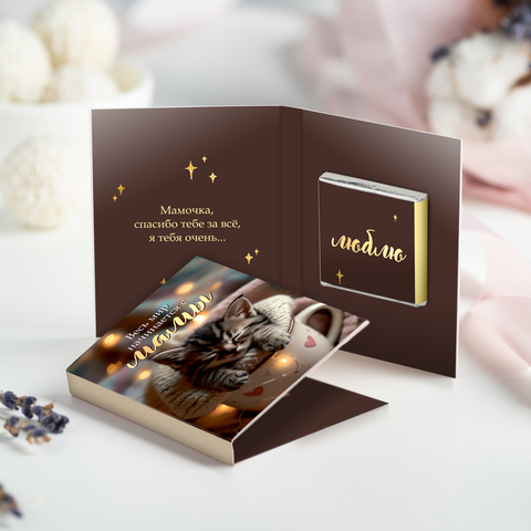 Внутри открытки - 1 шоколадка (вес 5 г., размер: 31 х 31 мм.)