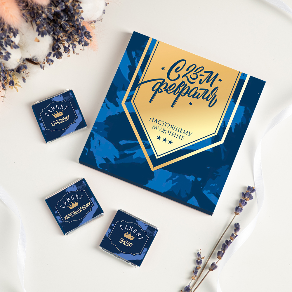 Каждая шоколадка упакована в индивидуальную этикетку с пожеланием.