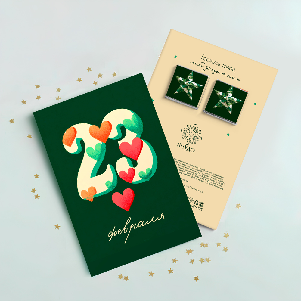 На обороте открытки - 2 шоколадки (вес каждой шоколадки: 5 г., размер: 31 х 31 мм.)