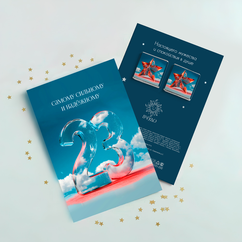 На обороте открытки - 2 шоколадки (вес каждой шоколадки: 5 г., размер: 31 х 31 мм.)