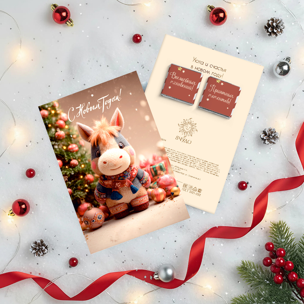 ★︎ Открытка 2 шоколадки "С Новым годом (лошадка под ёлкой)"