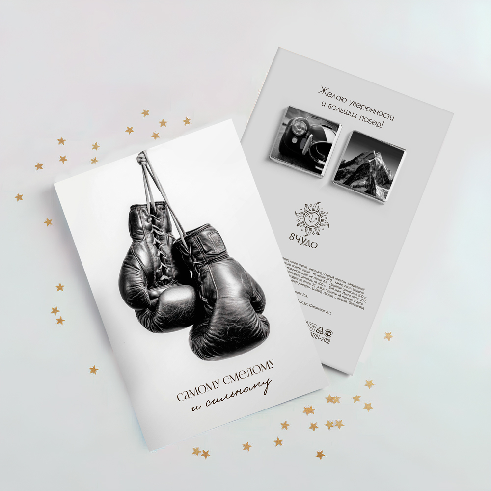 На обороте открытки - 2 шоколадки (вес каждой шоколадки: 5 г., размер: 31 х 31 мм.)