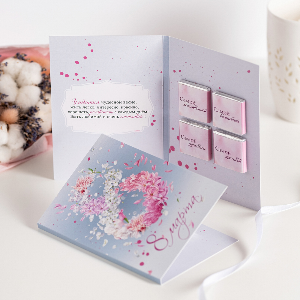 * Открытка 4 шоколадки "8 марта (белые и розовые цветы на светло-голубом)"
