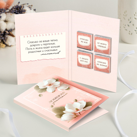 Открытка 4 шоколадки "Любимому учителю (розовая с цветами)"