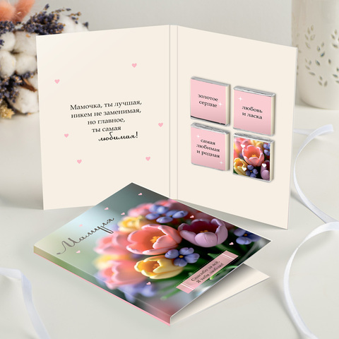 Внутри открытки - 4 шоколадки (вес каждой шоколадки: 5 г., размер: 31 х 31 мм.)
