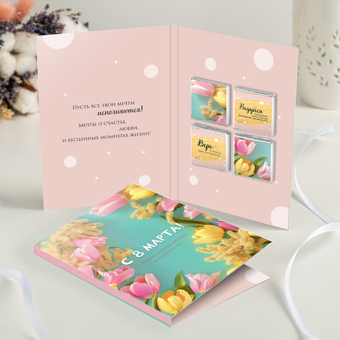 Открытка 4 шоколадки "С 8 марта! (тюльпаны и мимозы)"