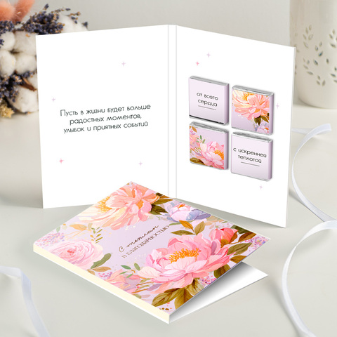 Внутри открытки - 4 шоколадки (вес каждой шоколадки: 5 г., размер: 31 х 31 мм.)