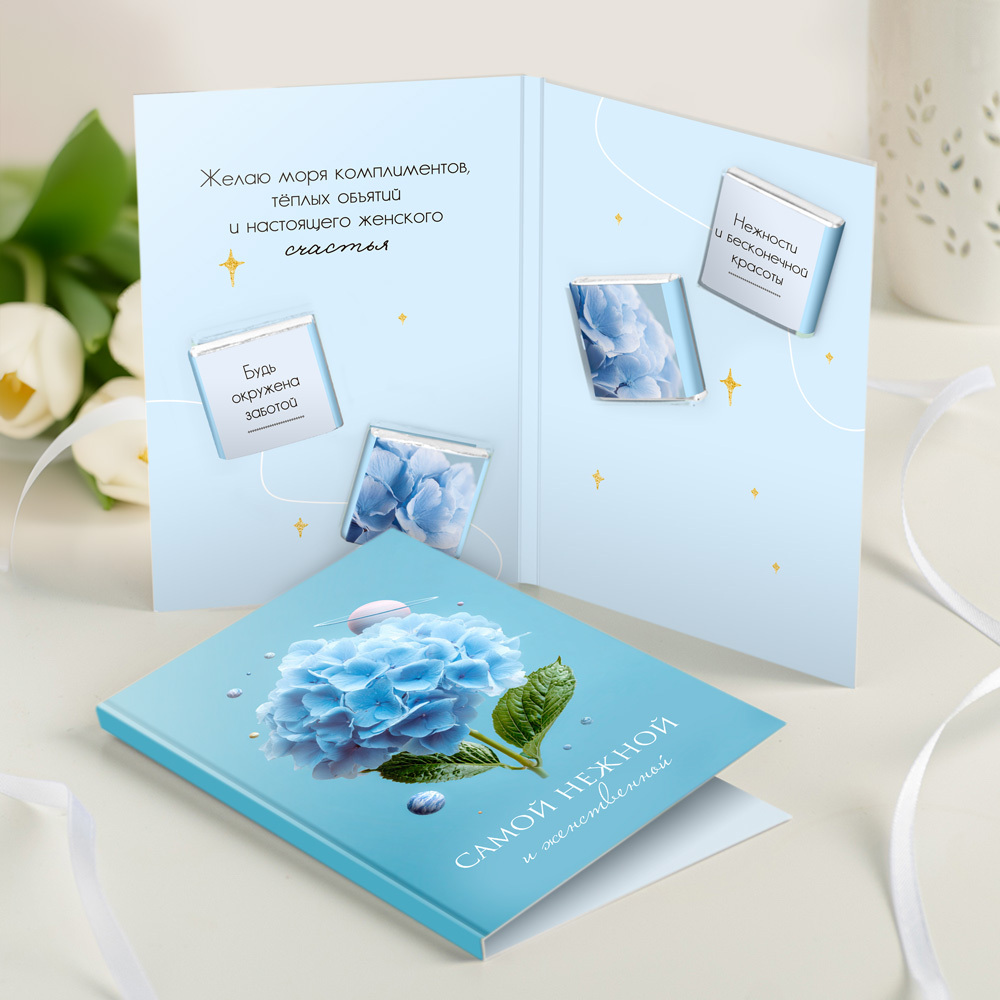 новинка Открытка 4 шоколадки "Самой нежной и женственной (гортензия с планетами)"