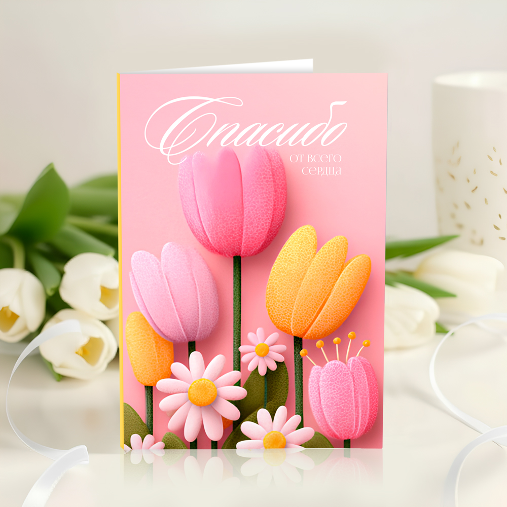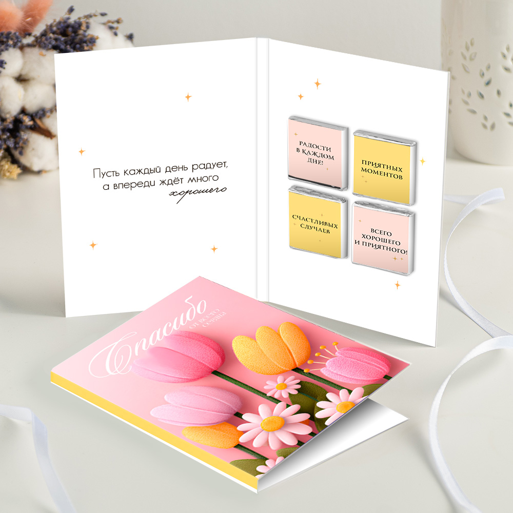 Открытка 4 шоколадки "Спасибо от всего сердца (розовая с тюльпанами)"